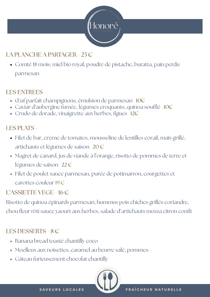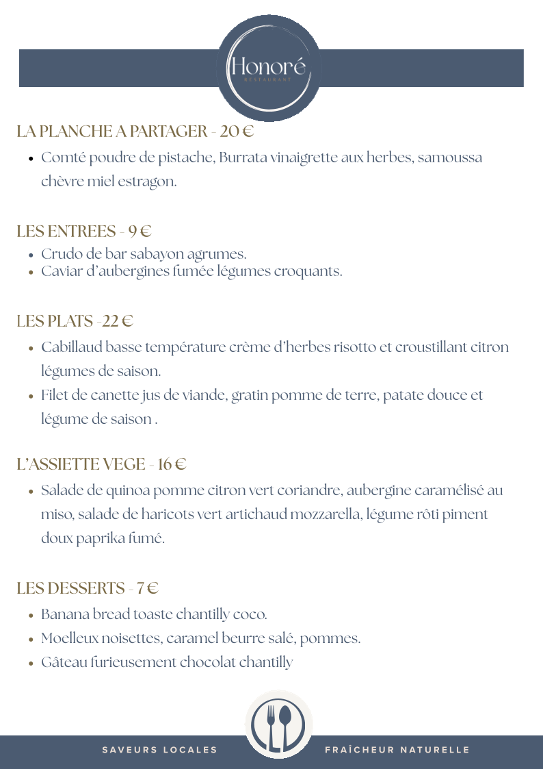 Overall, the menu at Honoré - Restaurant (Ex Zouzou) delivers a rich culinary experience, combining classic French flavors with a modern twist. Whether you're stopping by for a quick lunch or indulging in a leisurely dinner, there is something to satisfy every palate, all within a warm and inviting atmosphere.