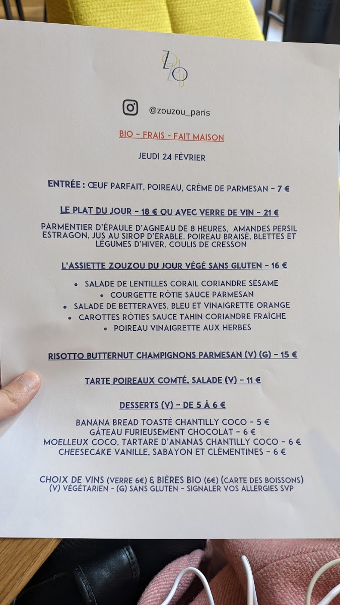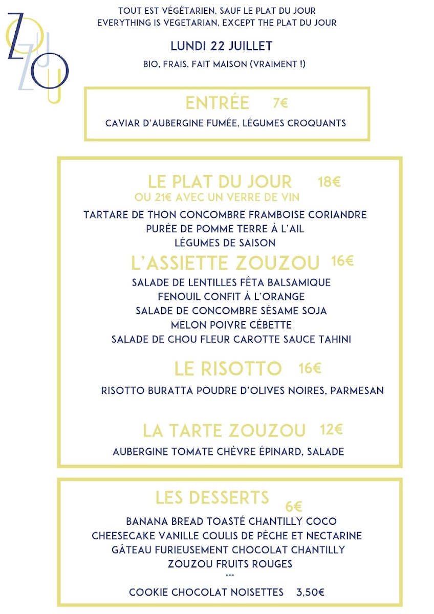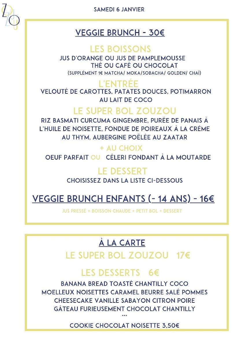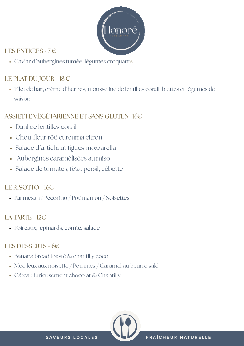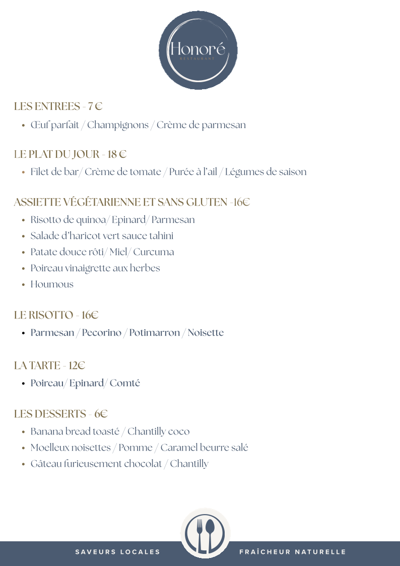 Honoré - Restaurant (Ex Zouzou) offers a delightful and diverse menu that brings together a variety of flavors and dishes, with a special focus on fresh ingredients and seasonal produce. The Déjeuner menu provides a perfect balance for lunch, with options like the Assiette Végé & sans gluten, ideal for those seeking a healthy, gluten-free meal. The Le Risotto is a comforting classic, rich and creamy, while La Tarte offers a light yet satisfying choice for those looking for something delicate. For those with a sweet tooth, the Les Desserts section will surely impress, featuring treats like the Banana Bread toasté chantilly coco, a warm and indulgent dish topped with coconut whipped cream, and the Gâteau furieusement chocolat, a decadent chocolate cake served with chantilly. The Moelleux noisette, pomme, caramel au beurre salé is another standout, combining hazelnuts, apple, and salted caramel for a perfect sweet ending.